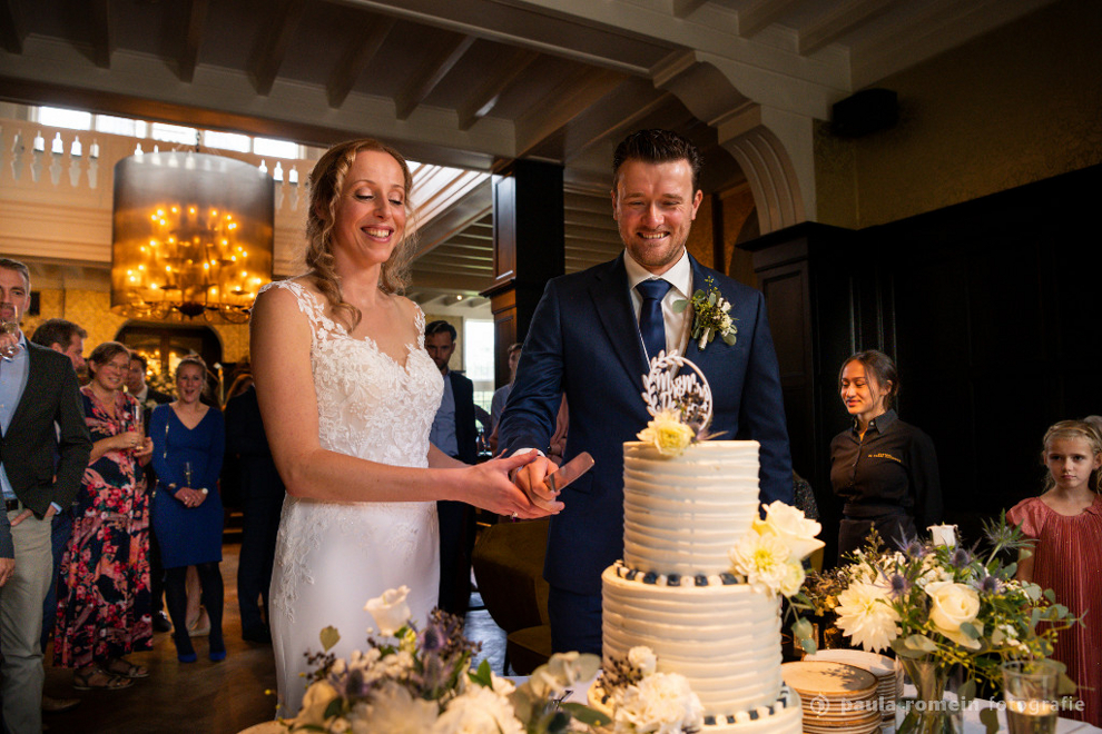 De bruidstaart aansnijden en de toost volgde in de hal met de grote kroonluchter. Er werd zelfs buiten op het terras verder geborreld. Hoe heerlijk als dat nog laat in het seizoen mogelijk is.