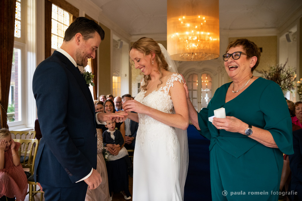 Al trouwden Paulina & Mark eind oktober, het was een mooie herstdag zodat we alle tijd hadden buiten de foto's te maken. Inclusief de fontein die nog aanstond. De trouwceremonie is in die periode dan wel fijn om warm binnen te houden. Daar hebben ze dan ook een geweldige, lichte trouwzaal voor. En hoe leuk dat de moeder van de bruidegom de ringen kwam brengen. Soms zijn het kindjes, dan weer een ouder of grootouder.